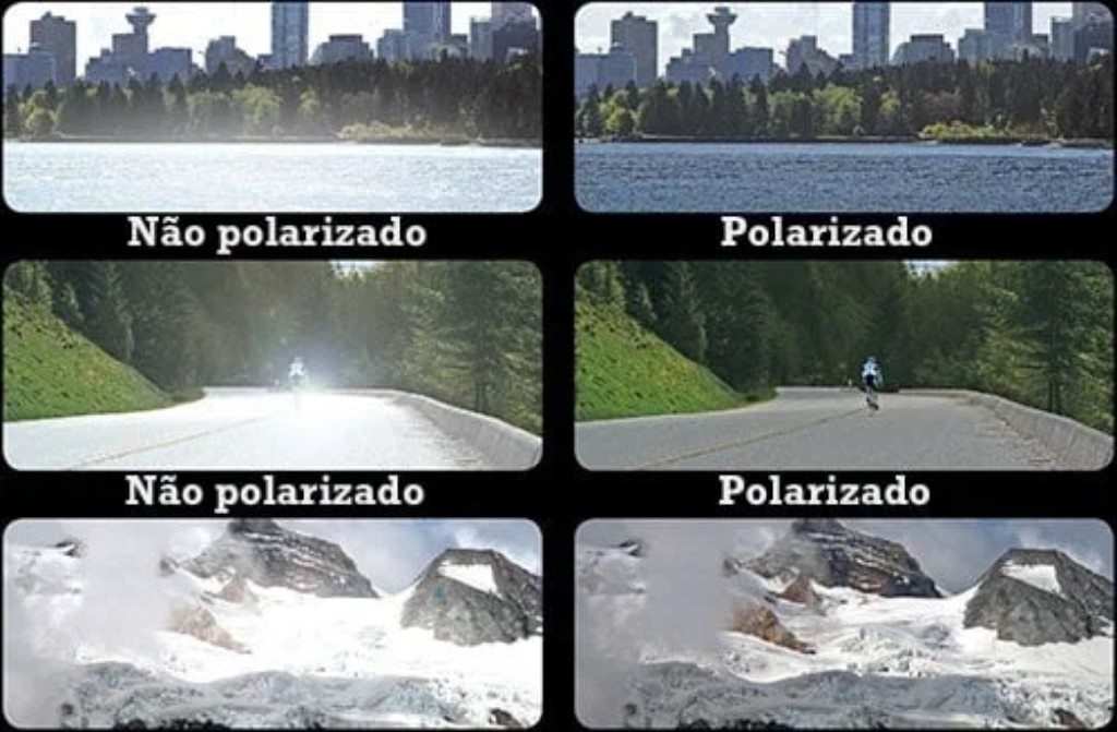 Lentes Polarizadas possuem um filtro especial que bloqueia a luz refletida e horizontal, reduzindo o brilho intenso de superfícies como a água, neve, estradas e até mesmo em carros.